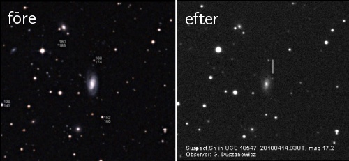 Galaxen UGC 10547 med sin nya svenskupptäckta supernova, som fått namnet 2010bq, upptäckt från ett amatörobservatorium utanför Stockholm natten till den 14 april. (bild: Odd Trondal, t v, Gregor Dusczanowicz, t h)