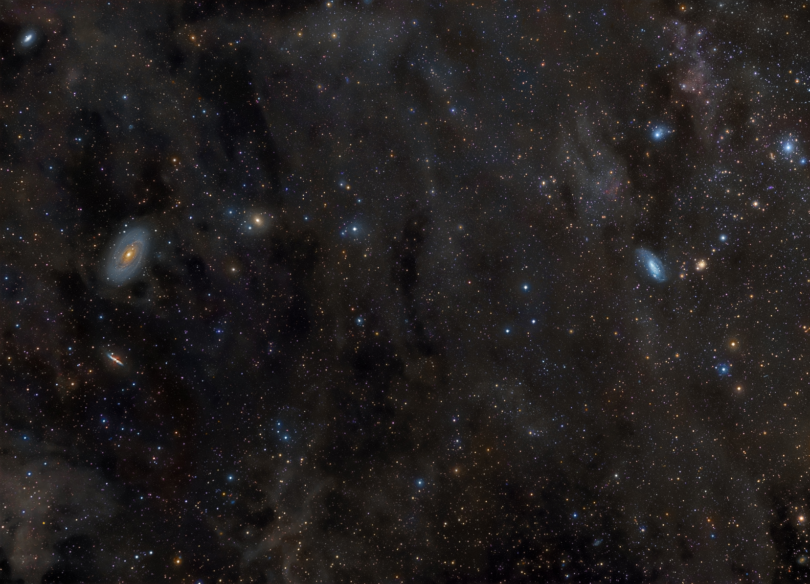 - På detta fantastiska fotografi över regionen syns M81 och M82 till vänster i bild. Coddingtons galax ligger på samma position men till höger i bild och skiftar i blått. Fotografi: Rogelio Bernal Andreo (besök gärna hans hemsida DeepSkyColors.com).