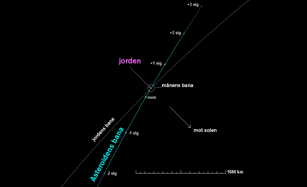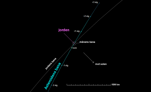 År 2040 finns risk att lilla asteroiden 2011 AG5 slår ner mot jorden. Punkterna längs banan visar var den befinner sig då med olika sannolikhetsgrad (Bild: NASA/JPL).