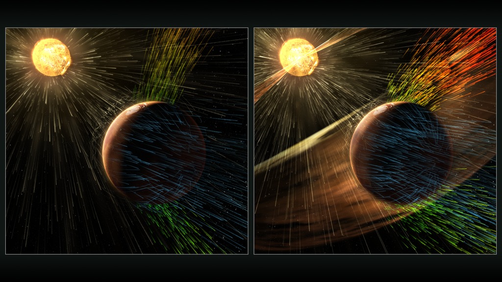Mars saknar något annat jämfört med jorden: ett start magnetfält, något som försvann tidigt i planetens historia, som kan skydda planeten mot kraftfulla solstormar. På jorden så drivs de laddade partiklarna (mestadels elektroner) i solvindarna mot polerna, vilket skapar våra vackra norrsken. På Mars bombarderas istället hela planeten av dessa partiklar, vilket höjde förlusten av atmosfären med en faktor 10, och täcker troligtvis hela planeten med en spektakulär föreställning av norrsken under nattetid. Under många miljarder år har detta gradvis nött bort Mars atmosfär. Men denna långsamma förtunning av atmosfären har två viktiga betydelser: