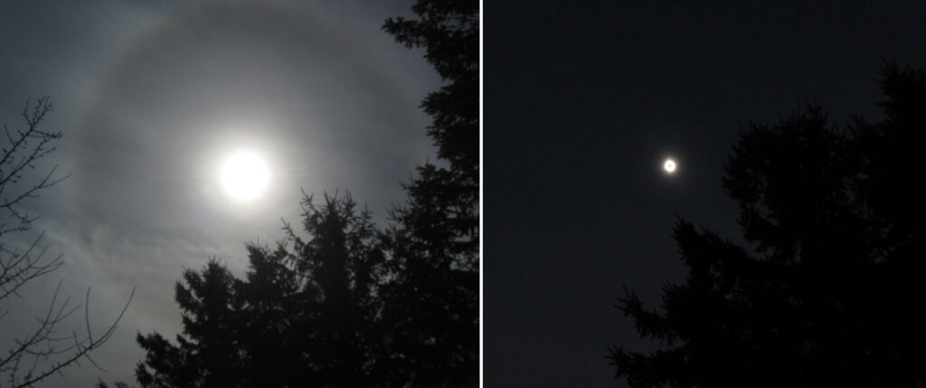 Slöjmolnen gav flera vackra och oväntade effekter. Till exempel en vacker halo runt solen när det bara var cirka 10 minuter kvar till totalitet. Månens skugga var dessutom synlig i slöjmolnen när den närmade sig oss. Istället hade vi oroat oss för att solens korona inte skulle vara så tydlig genom slöjmolnen. Tvärtom var koronan visst klart synlig (även om lite detaljer smetades ut).