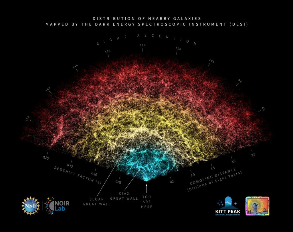 Med vår bild från James Webb-teleskopet till hjälp kan vi försöka uppskatta hur många galaxer det finns i det synliga universum. Projekt som SDSS och Desi studerar galaxernas fördelning i universum, och vi vet nu att universum på stora skalor liknar ett skum, där galaxerna är fördelade i sjok. Vissa områden i kosmos är desto fattigare på galaxer, vilket en ny karta (se nedan) från Desi-projektet tydligt visar. På himlavalvet ligger galaxerna däremot, i grova drag, ganska jämnt fördelade.