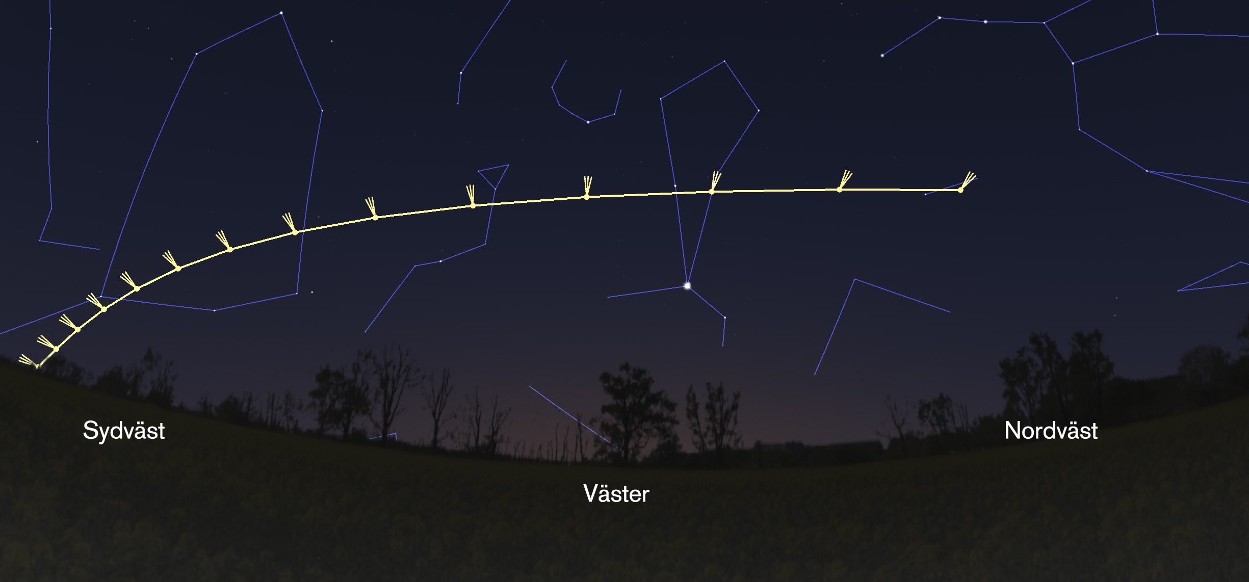 Kometen C/2025 A6 Lemmons position på kvällshimlen vid 19-tiden, sedd från Stockholm. Bild: Stellarium / Katrin Ros